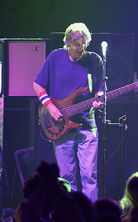 After the vocals ,the jam continued, though this time it was pretty propulsive. Molo took a solo and I thought they were going into a jazzy "Milestones"-like jam but then I realized it was the intro to my first ever live "Alligator." This was certainly a rockin' version. It was fun seeing Rob doing the kazoo bit, though I could barely hear it from our seats. I also couldn't hear Warren's slide much. The vocals on the PLQ version come across as a bit monotonous (but who could really match the soul of Pig's version?....Warren. perhaps?) and it seems when the PLQ sing lines together they're never fully in sync, but the instruments were rockin. The energy went up a notch after the "waggin' his tail" line. My dancin' shoes were on and I was hoping for an extended rockin' jam but it soon tumbled into spacey chaos. And for what seemed like the next 20 minutes it was a free-for-all. Lesh gave little or no directions through the monitor mike. He stood near Molo and kept doing fast "Caution" runs on his bass but he'd only do it for a few seconds before letting the jam become very abstract again. I was hoping for a full "Caution" (that'd make it 3 Anthem tunes for the night) but never got it. After one of his quick bass runs I thought I saw Phil shake his