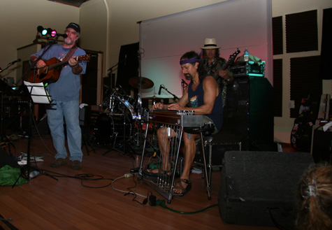 Vince warms the crowd up with a few solo acoustic numbers, with mookie and barry filling in. The room is overflowing with excitement. Great psychedelic light show projected on a variety of huge tie-dies.